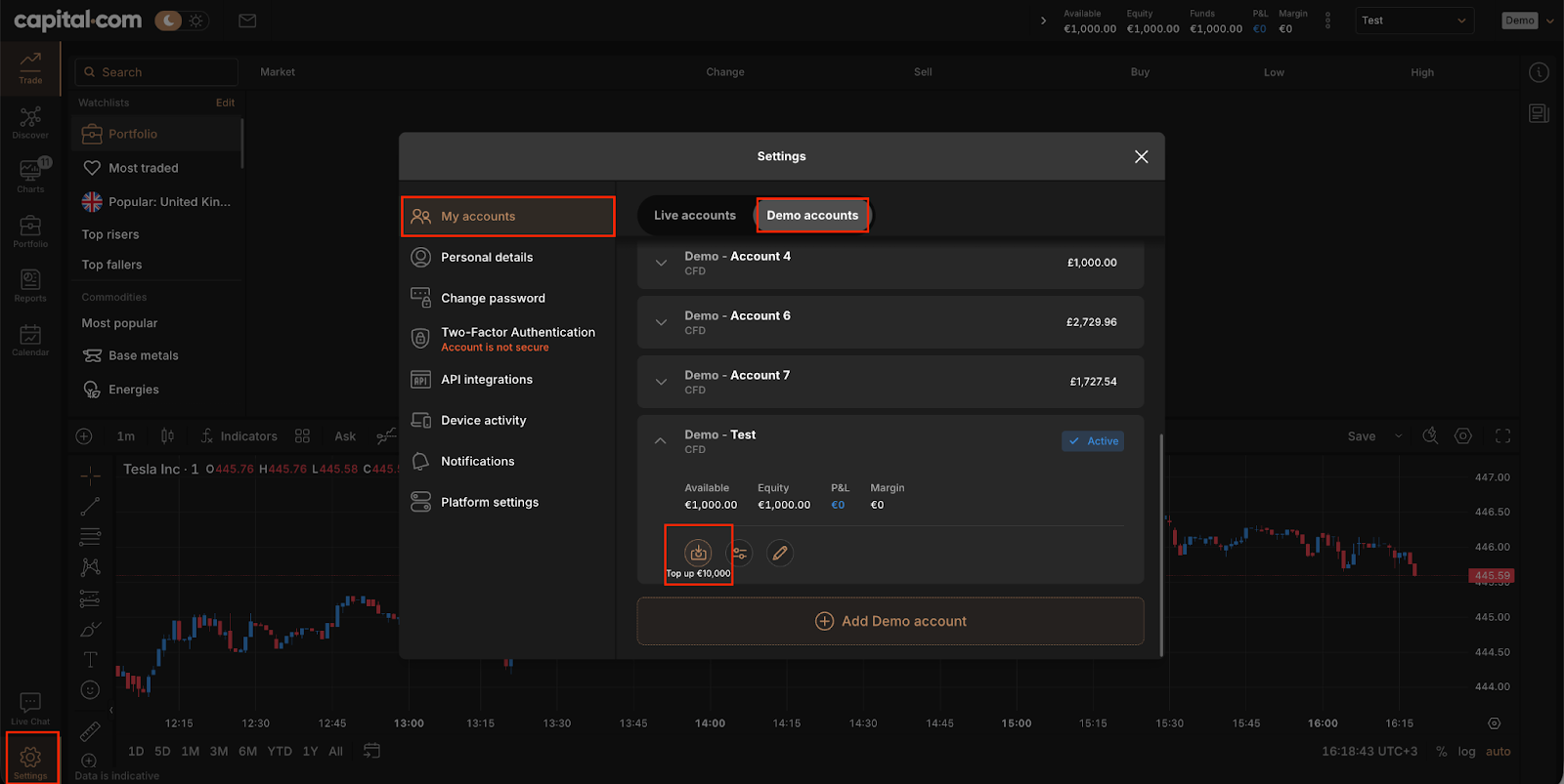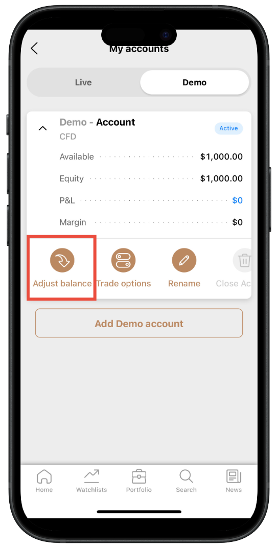 اختر حساب العرض التجريبي الذي تريد تعديله، ثم اضغط على "تعديل الرصيد".