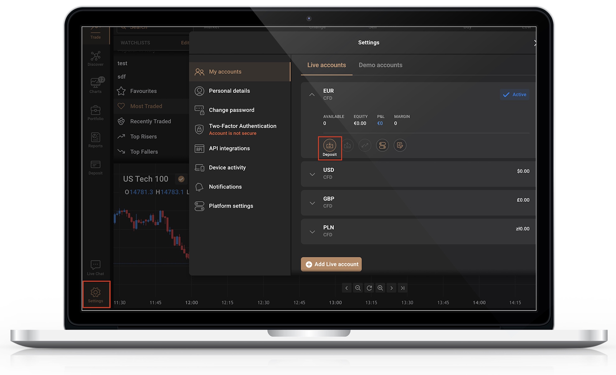 'Ρυθμίσεις' 'Οι λογαριασμοί μου', επιλέξτε τον λογαριασμό και κάντε κλικ στο 'Κατάθεση'.