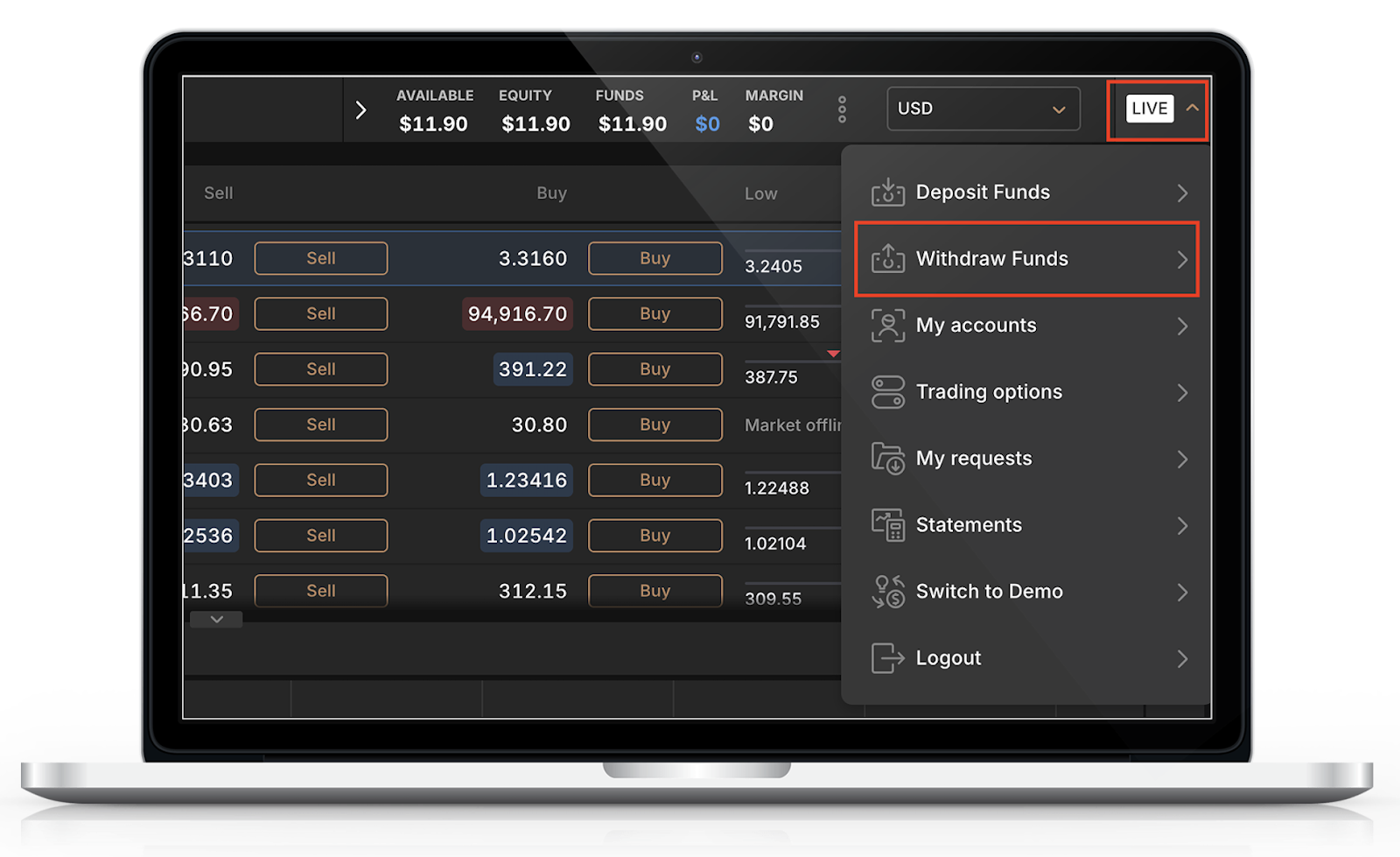 2. Cliquez sur Live (coin supérieur droit) Retirer des fonds.