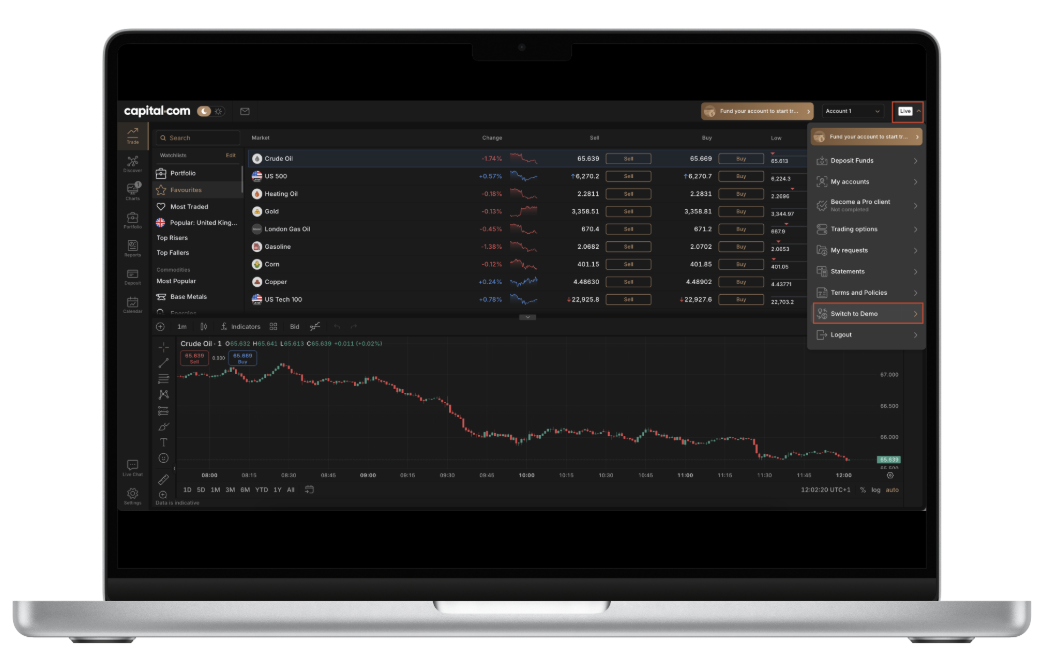 Appuyez sur « Compte » dans le coin supérieur gauche, puis sélectionnez « Passer en mode Démo » ou « Passer en mode Réel ».