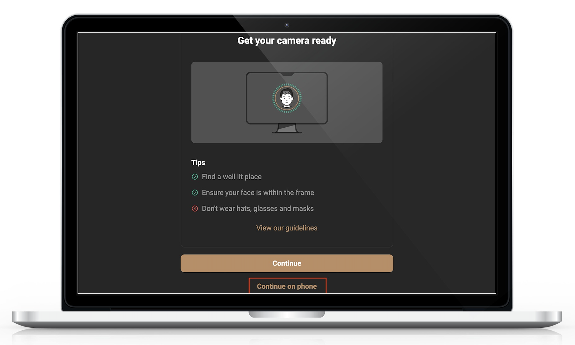 Ha nincs kamerája a laptopján/számítógépén, folytathatja a fiókellenőrzést a telefonján. Ebben az esetben kattintson a "Folytatás telefonon" lehetőségre, és megjelenik egy QR-kód, amelyet a készülékével be kell olvasni. Alternatívaként kimásolhatja a linket, és megnyithatja a telefonján.