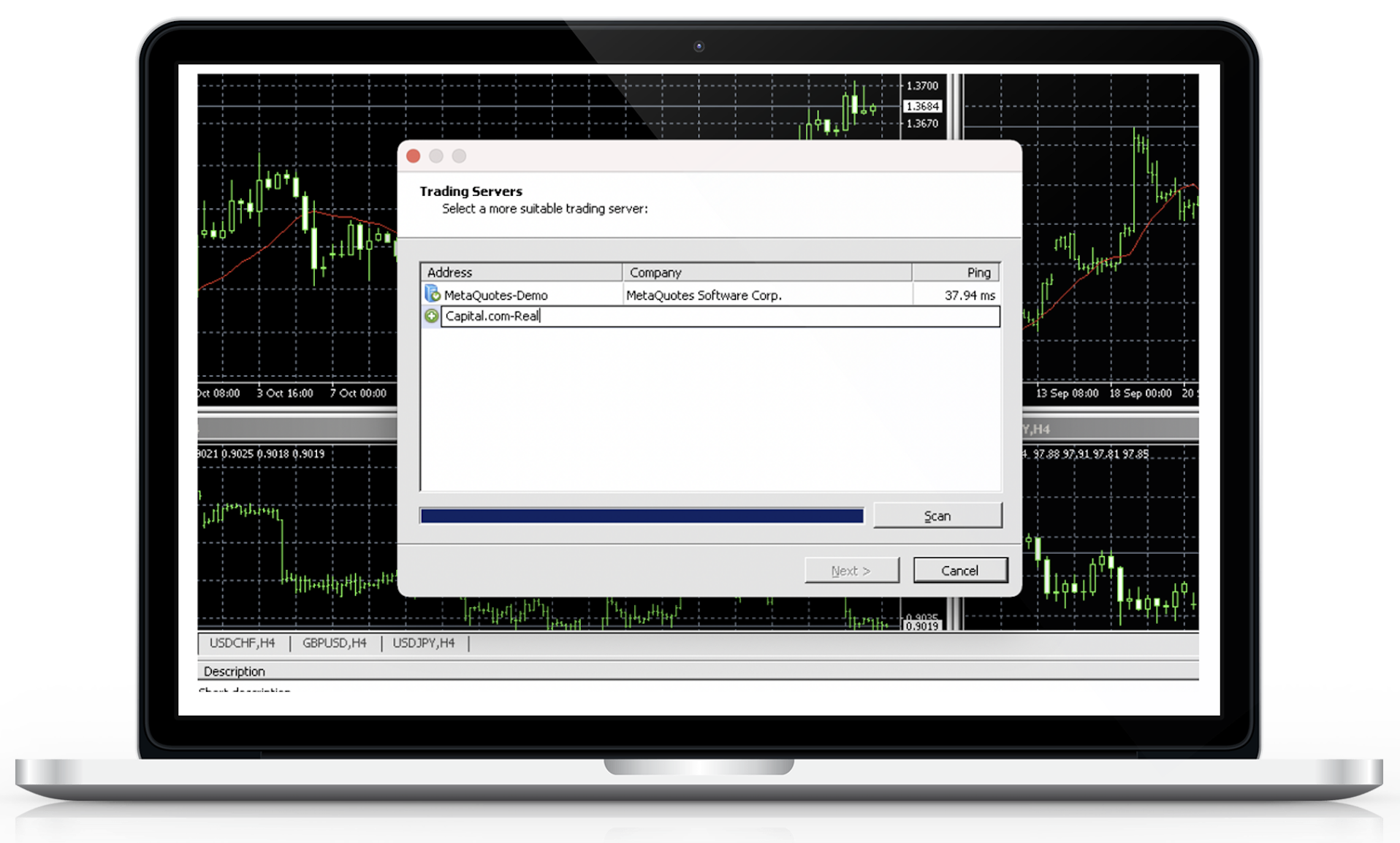 Kai paieška baigsis, Trading Servers lange matysite 2 naujus serverius. Pasirinkite „Capital.com-Real“ arba „Capital.com-Demo“, priklausomai nuo to, ar sukūrėte gyvą ar demo MT4 paskyrą Capital.com platformoje. Pasirinkę atitinkamą paskyrą, spustelėkite „Next“.