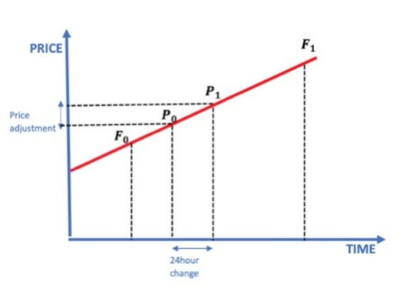 Laika gaitā mūsu neapstrādātā cena pakāpeniski pārvietojas no tuvākā līguma cenas uz nākamo, lai izvairītos no nepieciešamības pēc beigu datuma (dažreiz saukta par pārvietošanas datumu).