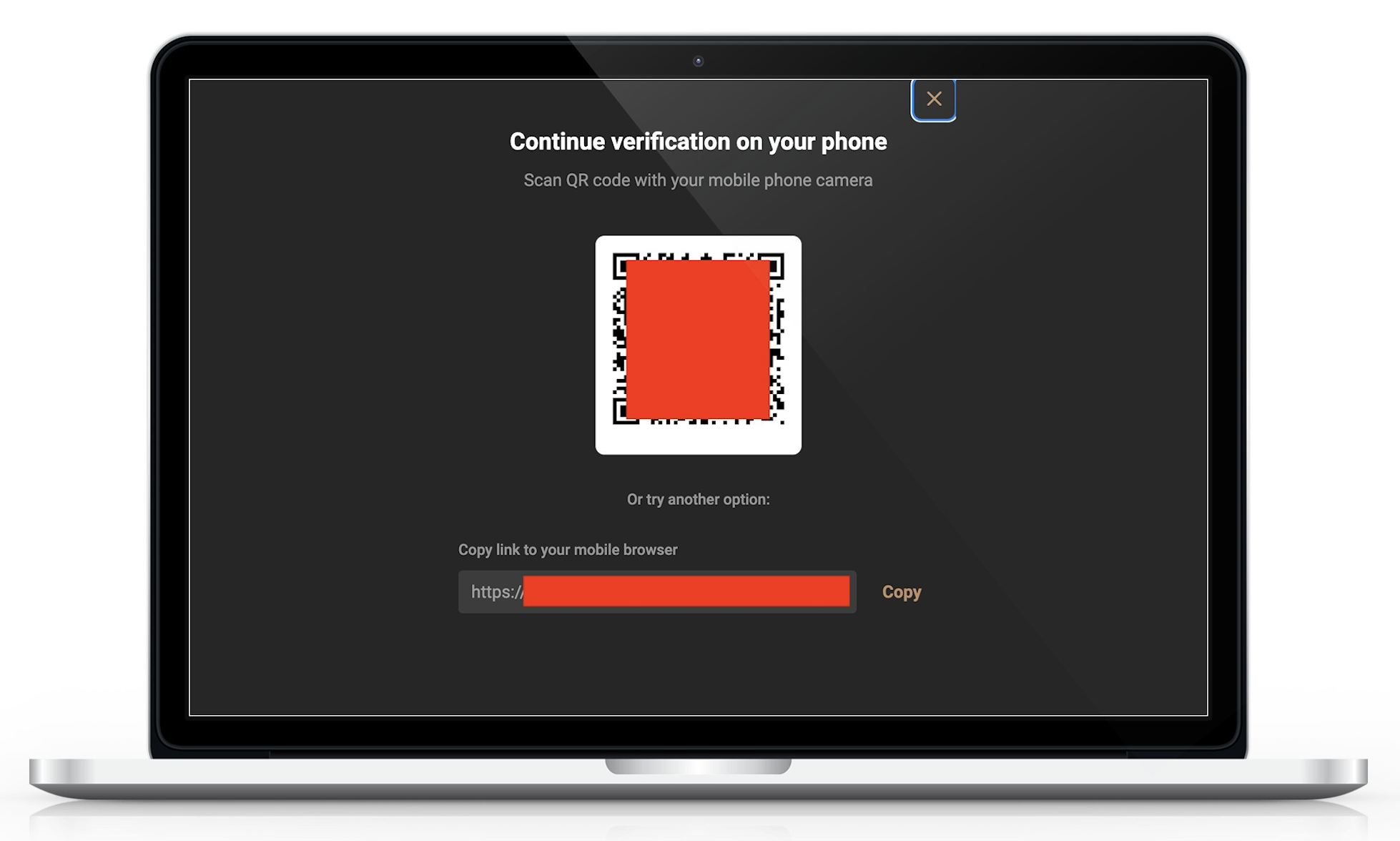 Als je geen camera op je laptop/computer hebt, kun je ervoor kiezen om door te gaan met de accountverificatie op je telefoon. Klik in dat geval op "Doorgaan op een telefoon" en je ziet een QR-code die je met je apparaat kunt scannen. Je kunt ook de link kopiëren en openen op je telefoon.