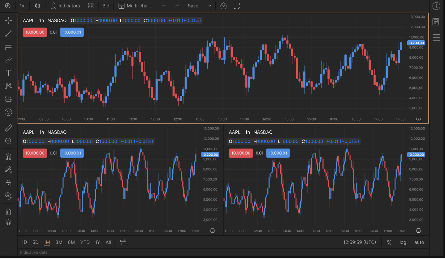ต้องการดูว่าตลาดเป็นอย่างไรบนกราฟห้านาทีและกราฟรายวันพร้อมกันไหม? ด้วยมัลติชาร์ต คุณสามารถซ้อนทับมุมมองหลายมุมของสินทรัพย์เดียวกันด้วยช่วงเวลาที่แตกต่างกันโดยไม่ต้องสลับไปมา