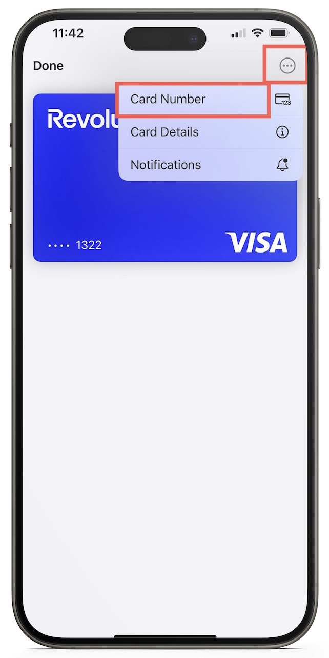 - 在 iOS 上,进入您的 Apple Pay 钱包,点击相关卡片,点击右上角的三个点,然后选择“卡号”。